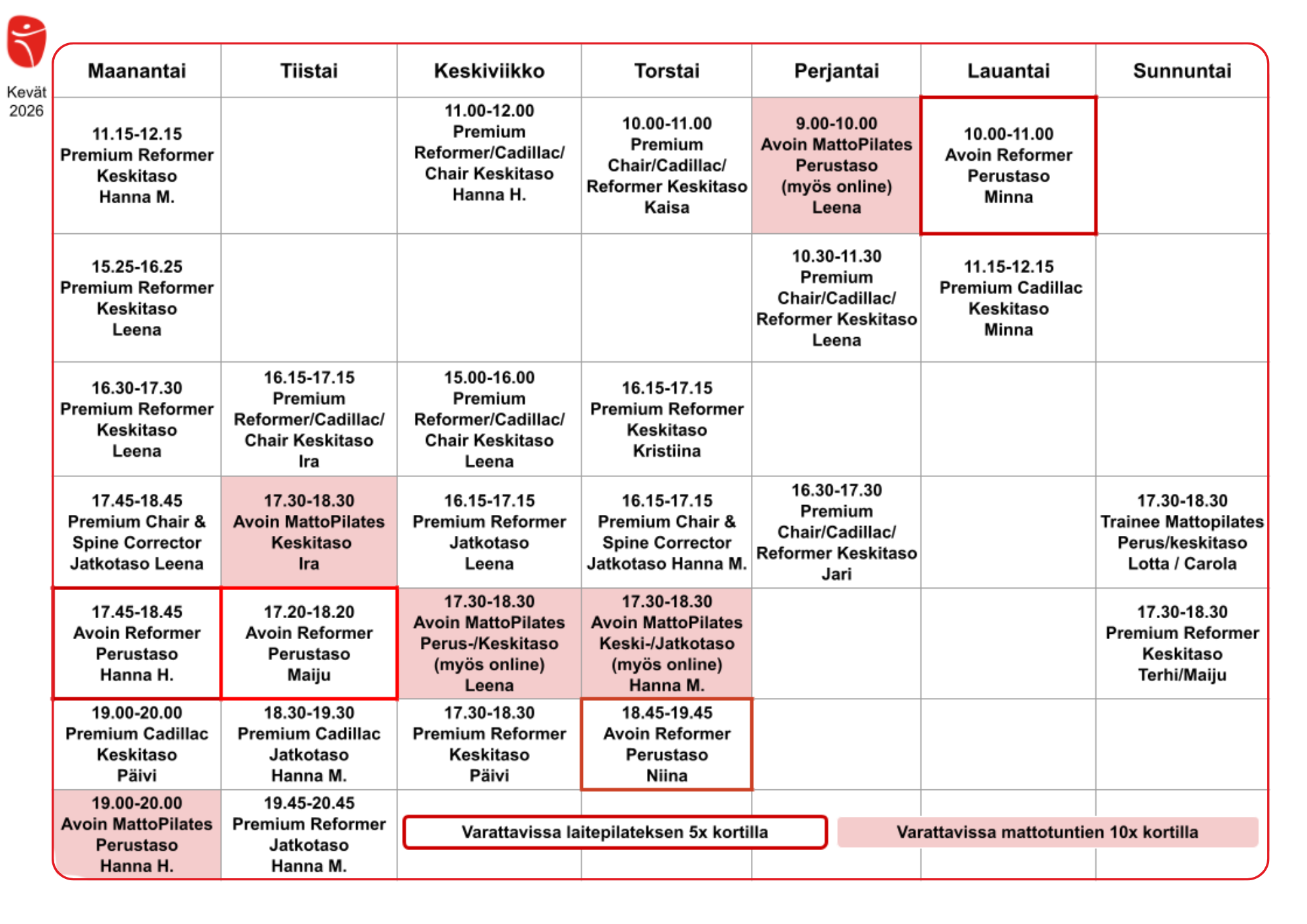 Lauantai klo 10.00-11.00 Avoin Reformer / Perustaso